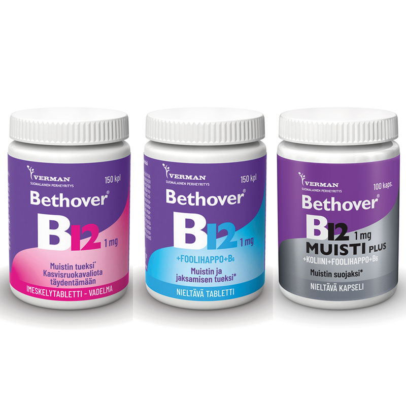 Bethover B12 tai B12 Muisti Plus vitamiinit 100 kaps. tai 150 tabl.